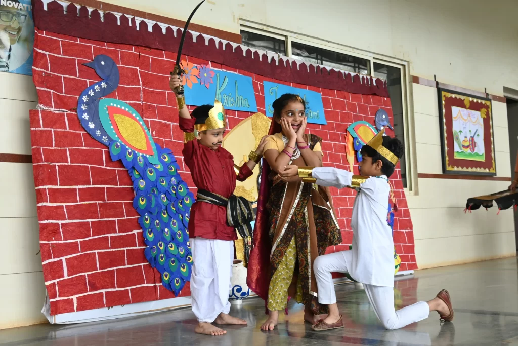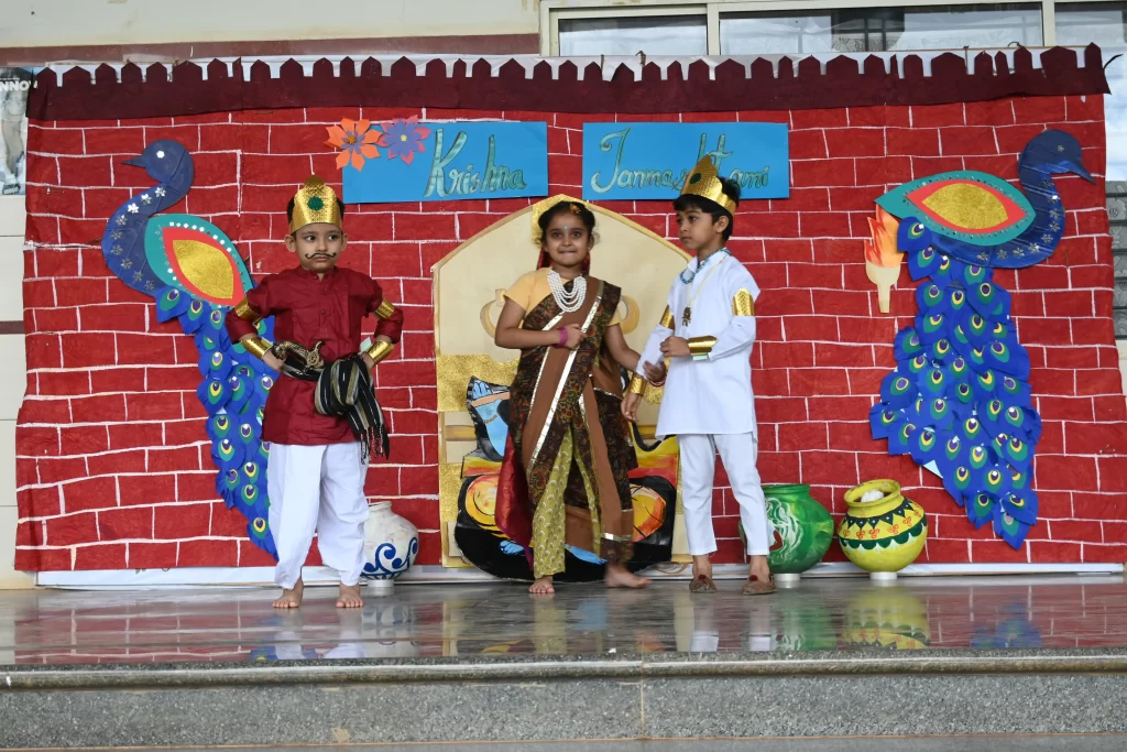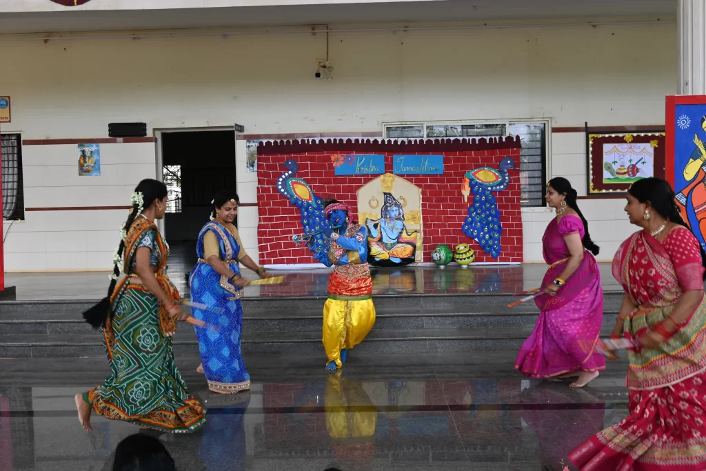 Krishna Janmashtami was celebrated with boundless energy and enthusiasm by the Kindergarten students and teachers. The vibrant festivities included a delightful skit narrating the life of Lord Krishna, where the young performers, brimming with confidence, brought the timeless story to life with captivating expressions and dialogue. Teachers joined in with equal fervor, guiding and encouraging the children to shine on stage. The joyous celebration reflected the collective exuberance, creativity, and spirit of the Vishwavidyapeeth community, making it a memorable day filled with devotion and delight.