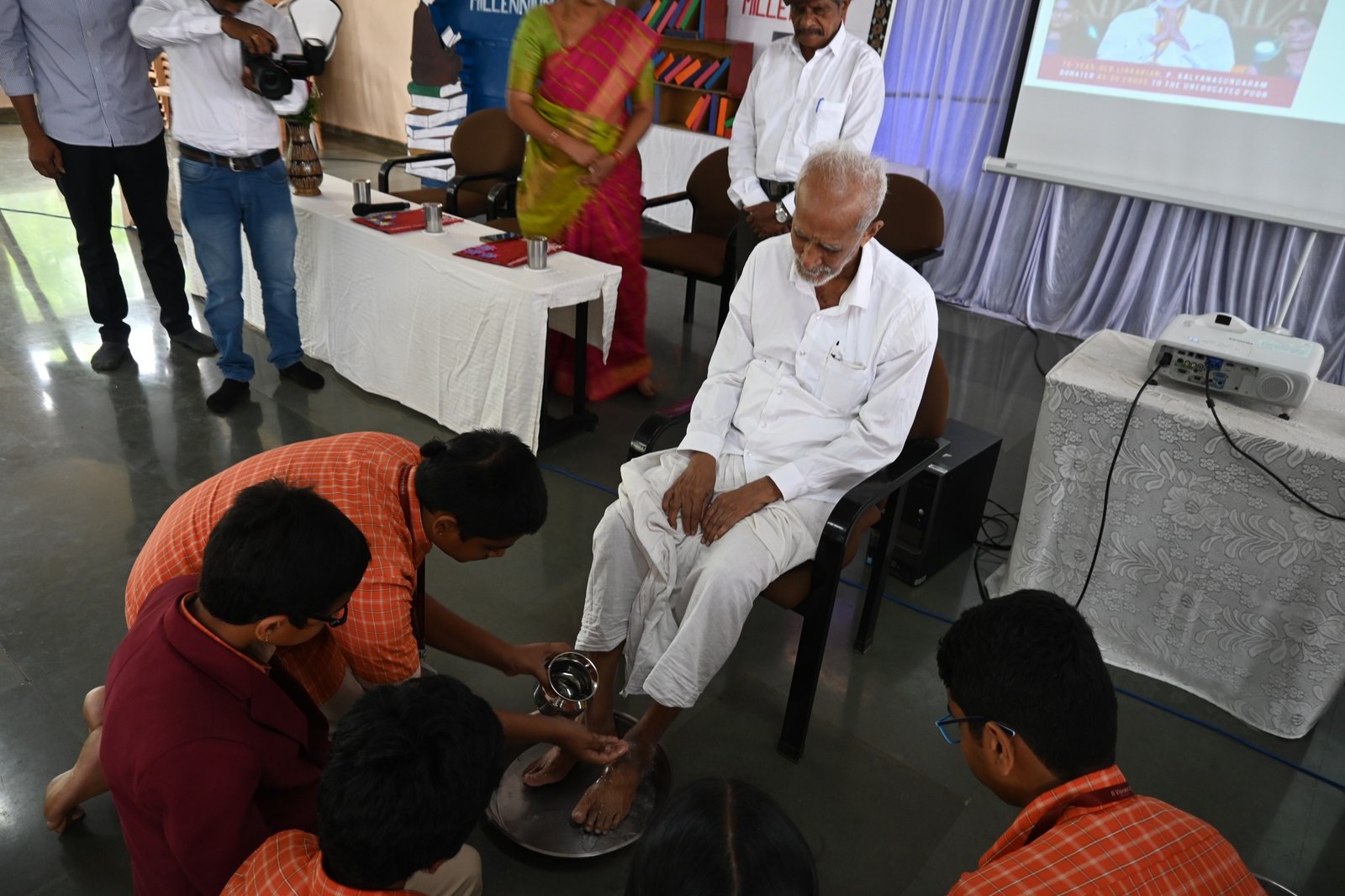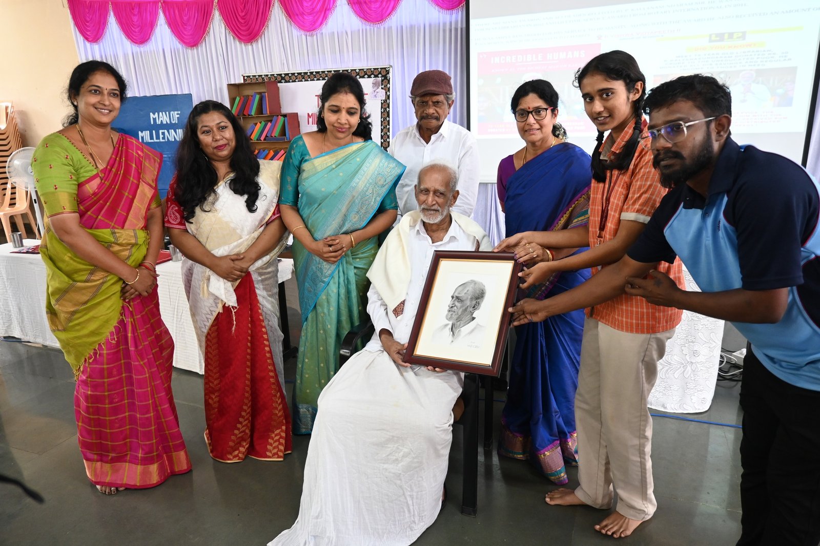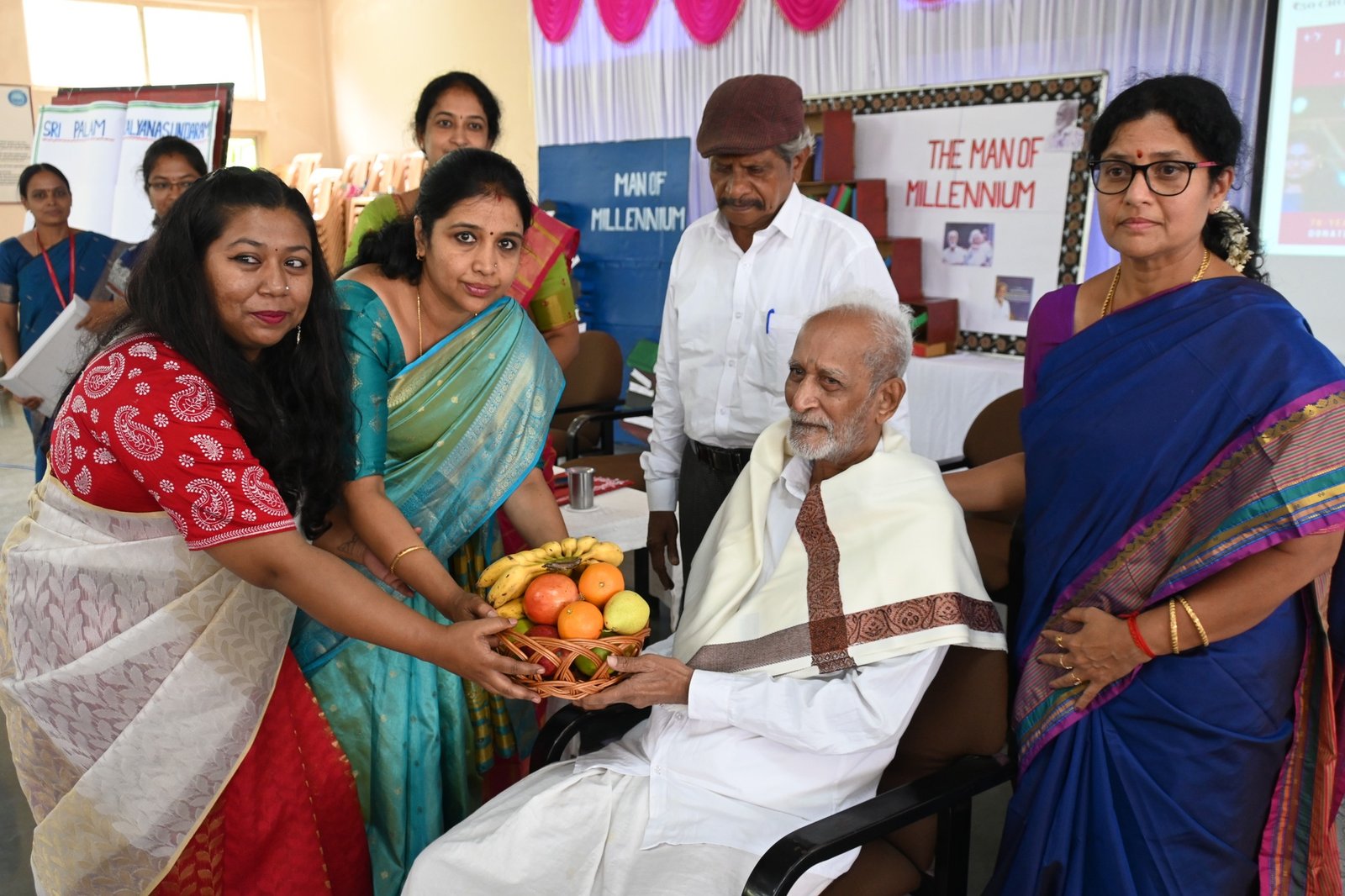 We are honoured to receive the blessings of the eminent philanthropist, Sri Palam Kalyanasundaram. We are thankful and extend our gratitude to the Padmashree Awardee for gracing us with his presence. An event was planned to felicitate the guest with a short cultural programme which consisted of a mesmerising welcome dance by class 7 cbse student, Loukya Reddy. She presented the traditional form of dance named karaga. The guest was felicitated with student made thankyou cards and a live portrait of him by our beloved Director ma’am expressing deep gratitude at his visit. A special felicitation was offered by conducting Pada Puja to the honoree. Palam sir was requested to deliver a speech to motivate the gathering and it was a cherishable moment knowing about this great man. In his speech he mentioned his mother to be his role model and inspiration to achieve great height. The event played an important role in providing our students to interact and exercise the art of interviewing to know more about and appreciate the distinguished guest. The event was also covered by TV 5. To commemorate the guest’s visit his autograph was taken on a huge canvas book created by our students. The programme culminated with vote of thanks and Shanti Mantra. The students and staff were blessed with this lifetime opportunity to witness and interact with this real life hero who has won millions of hearts with his humble and helpful attitude. We are immensely thankful to our beloved Director Ma’am Smt Suseela Santhosh who strived to make it a reality for the students to meet such eminent figures in person who are only read and seen from far.