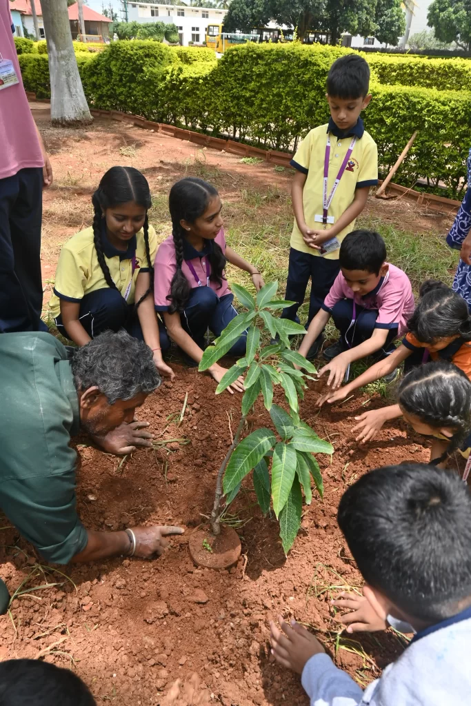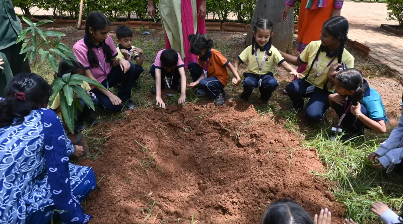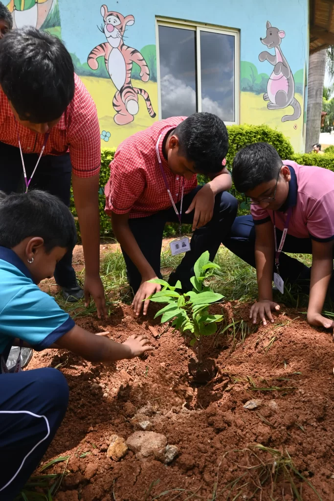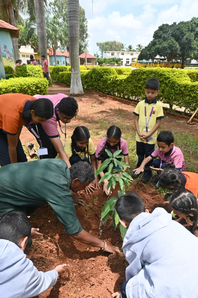 “Celebrating Vanamahotsav at Vishwa Vidyapeeth!  The students of the outgoing batch of Grade 10 and the incoming new batch of Grade 1 planted trees together to celebrate World Environment Day. The idea is not to live forever but to create something that will. With this in mind, the students of Grade 10 IGCSE planted two trees in the campus. As this is their last year in the school, they leave behind the value of protecting nature. The first graders helped them with this as they will now become the custodians of the trees and take care of them year after year till they are ready to plant their own tree.”